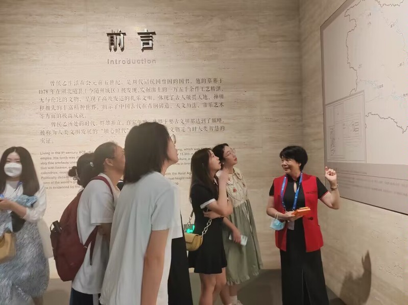 经济与商务与学院新闻中心讯(记者 杨萌)为响应习近平总书记 “要在提炼、转化、融合上下功夫,让收藏在馆所里的文物、陈列在大地上的遗产、书写在古籍里的文字成为教书育人的丰厚资源”号召。结合“中国文化概论”课程进度,2023年6月11日下午,beat365中文官方网站经济与商务外语学院刘芬老师兼湖北省博物馆志愿者讲解员在湖北省博物馆社教部志愿者团队老师们的支持帮助下,在博物馆为学生们开展中国文化教育,将课程思政落实到博物馆参观学习中,在具体的文化场景,培养学生们的综合文化素养、家国情怀和文化自信。