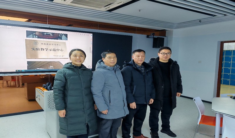 2024年1月2日,我校实验教学中心颜爱国副主任兼教务部副部长、经济与商务外语学院马洁副院长、外语实验室王志华老师一行在中国地质大学省级语言示范中心董成见主任的带领下,参观调研了语言实验室、高清录播室、虚拟仿真微课制作实验室、雅思中心等。