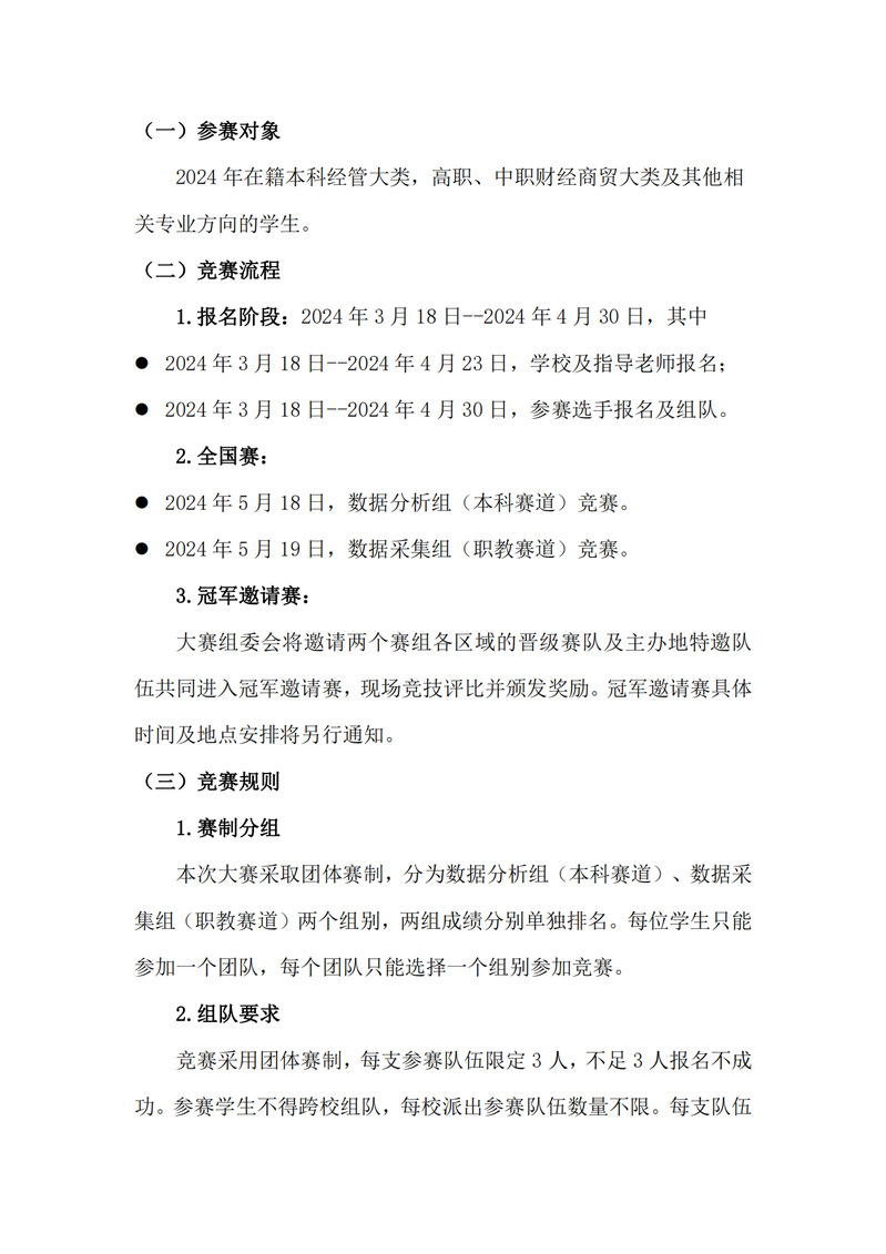 为深入贯彻落实《“十四五”数字经济发展规划》(国发〔2021〕29号)及《国家职业教育改革实施方案》的精神,提高教育服务建设数字化经济体系和实现更高质量更充分就业需要,加强财经行业应用型、技术技能型人才培养、提升财经相关专业人才大数据处理与分析能力,推进院校专业建设和教学改革,经研究决定举办2024年第三届全国财经大数据处理大赛。本次大赛主办单位为中国商业会计协会,承办单位为beat365中文官方网站(数据分析组)、江苏经贸职业技术学院(数据采集组)、深圳希施玛数据科技有限公司。具体报名事宜如下: