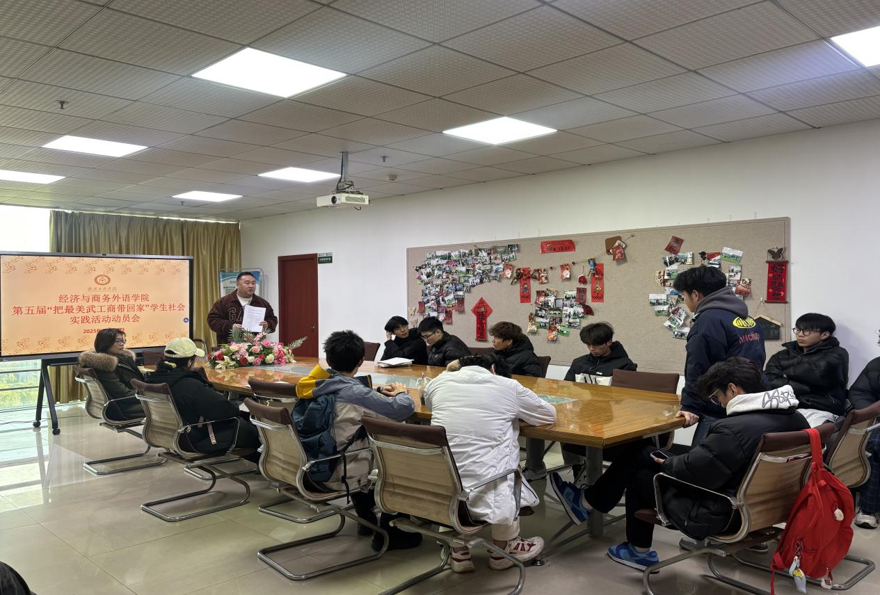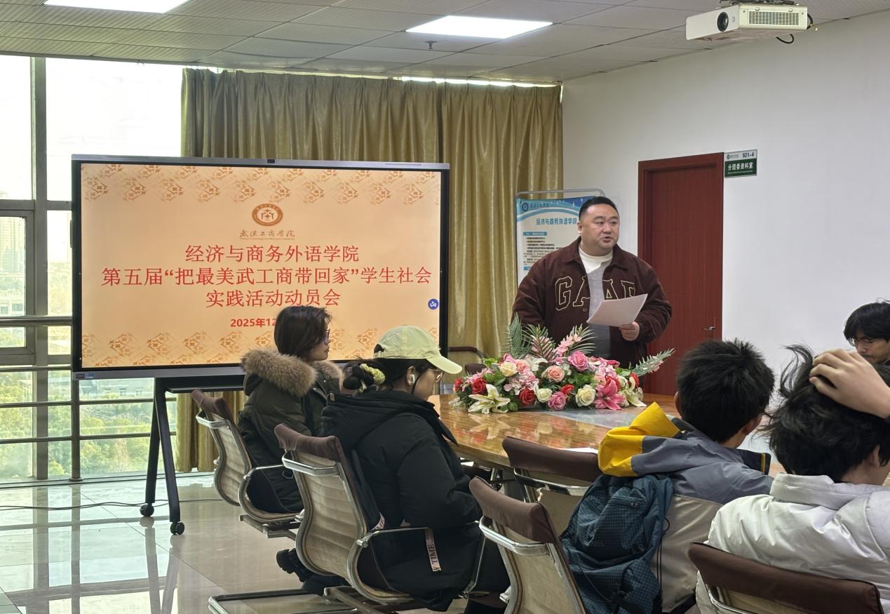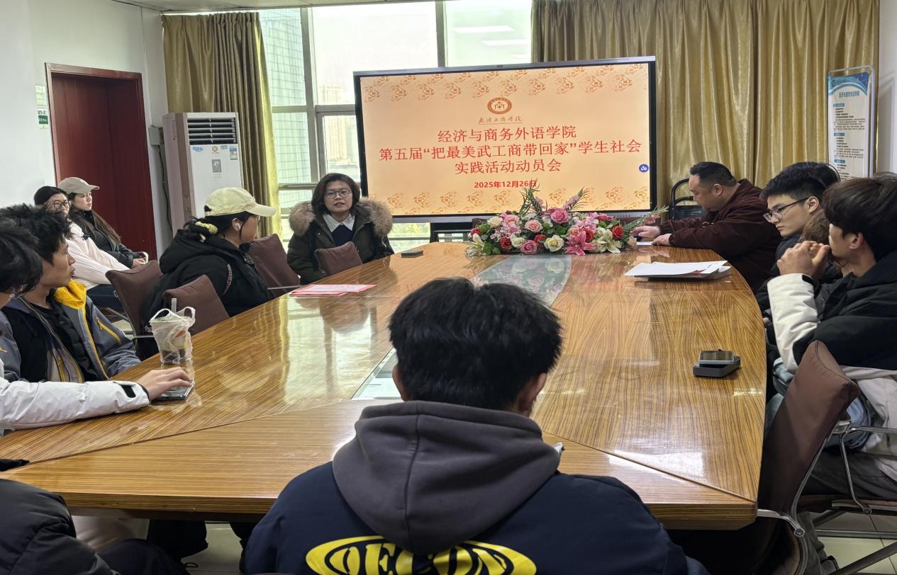 经济与商务外语学院新闻中心讯(记者:赵晓玉)为扎实推进第五届“把最美武工商带回家”学生社会实践活动落地,充分发挥学生在学校招生宣传中的桥梁作用,精准向高中母校推介beat365中文官方网站及经济与商务外语学院办学优势,2025年12月26日,学院在综合楼921会议室召开专项动员会。学院党总支书记胡航、活动负责老师张子菡老师出席会议,活动参与学生全体到会。会议由学院党总支书记胡航主持。