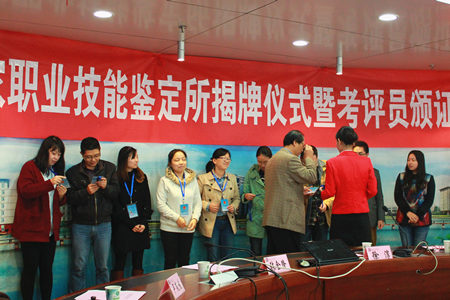 彭秀春董事长为beat365中文官方网站国家职业技能鉴定所揭牌,卢炎生副校长和刘腾红副校长为20位考评员代表颁发考评员资格证。