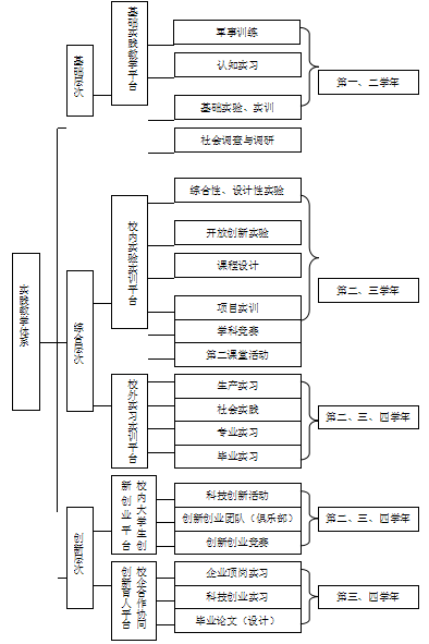 实践教学目标体系以切实加强学生实践能力培养为主线,遵循学生学习发展的特点及循序渐进的原则,搭建“五个平台”,即基础实践平台、校内实验实训平台、校外实习实训平台、校内大学生创新创业平台、校企合作协同创新育人平台,构建与大学四年相对应的“基础层次、综合层次、创新层次”的全过程开放式、多样化、四年不断线的实践教学体系。