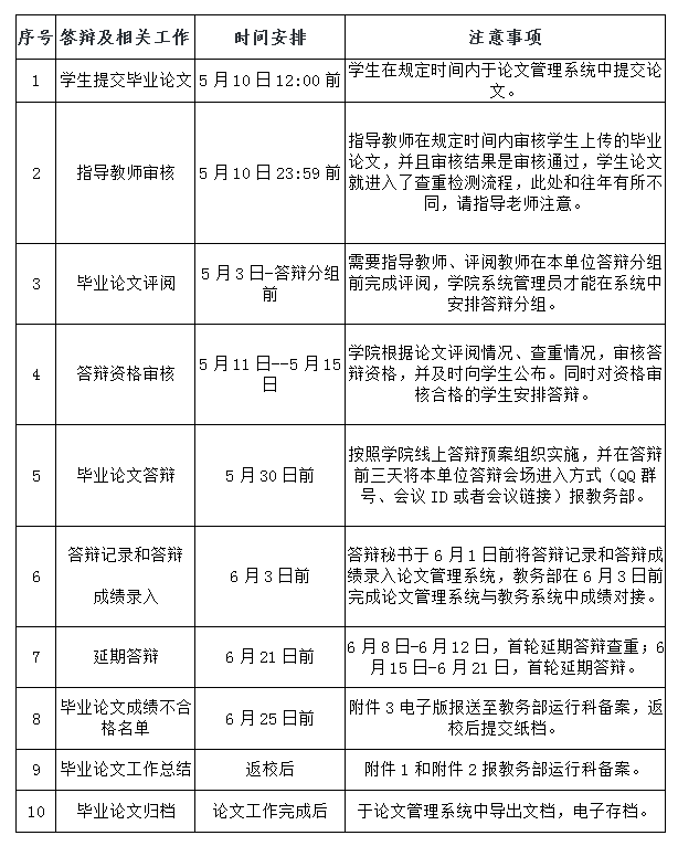 2.各学院对2020届本科生毕业论文工作进行总结,全面分析毕业论文的难度、工作量、综合训练情况、在社会实践中完成情况、指导教师情况等,重点总结毕业论文质量情况、工作特色和经验、使用论文管理系统和在线答辩中遇到的问题、改进措施和建议(模板见附件2),于返校后提交学院2020届毕业论文工作总结至教务部运行科。
