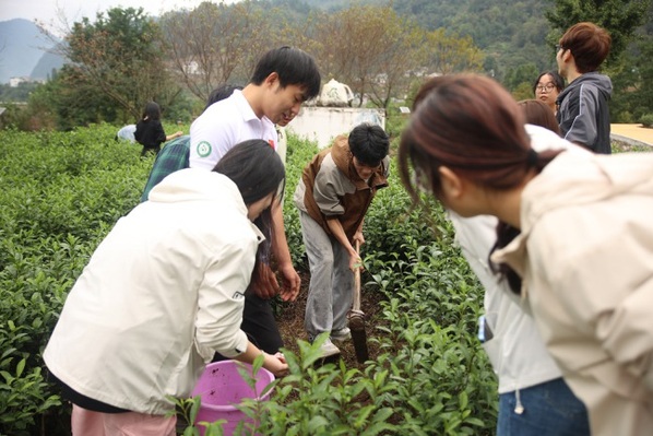 新闻中心讯(记者 周逸文 蓝静)“施肥的时候肥料不能洒在茶树根部,要保持一定的距离,避免‘烧根’......”,10月19日上午,在秭归县九畹溪镇石柱村圣天庄园茶叶种植示范基地,基地负责人吴光全手把手地教一群大学生给茶树松土施肥、修剪树枝、锄草等。这是beat365中文官方网站管理学院为70多名大学生组织的一场生动的劳动实践课。