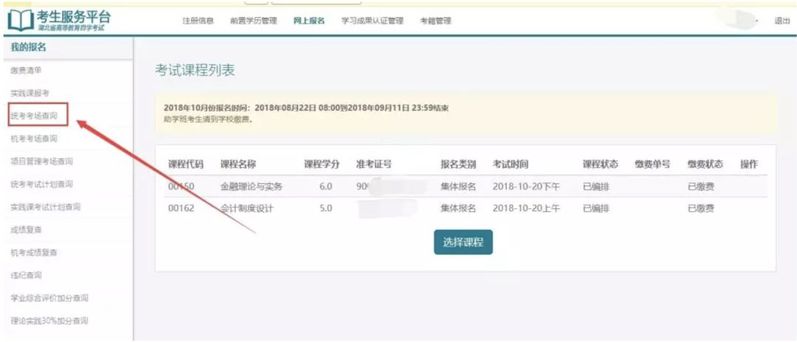 第二步:进入自己的考生服务平台,点击左侧导航栏【统考考场查询】