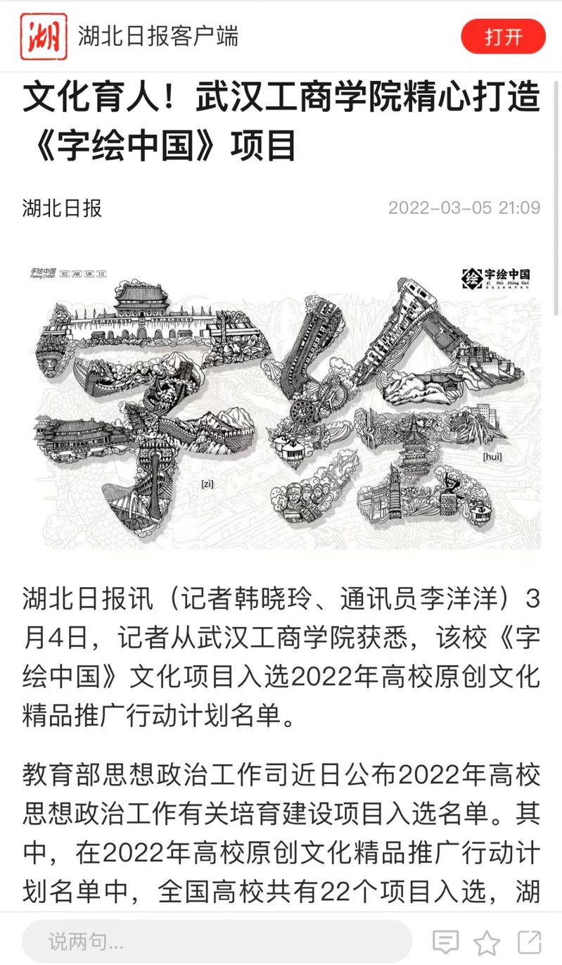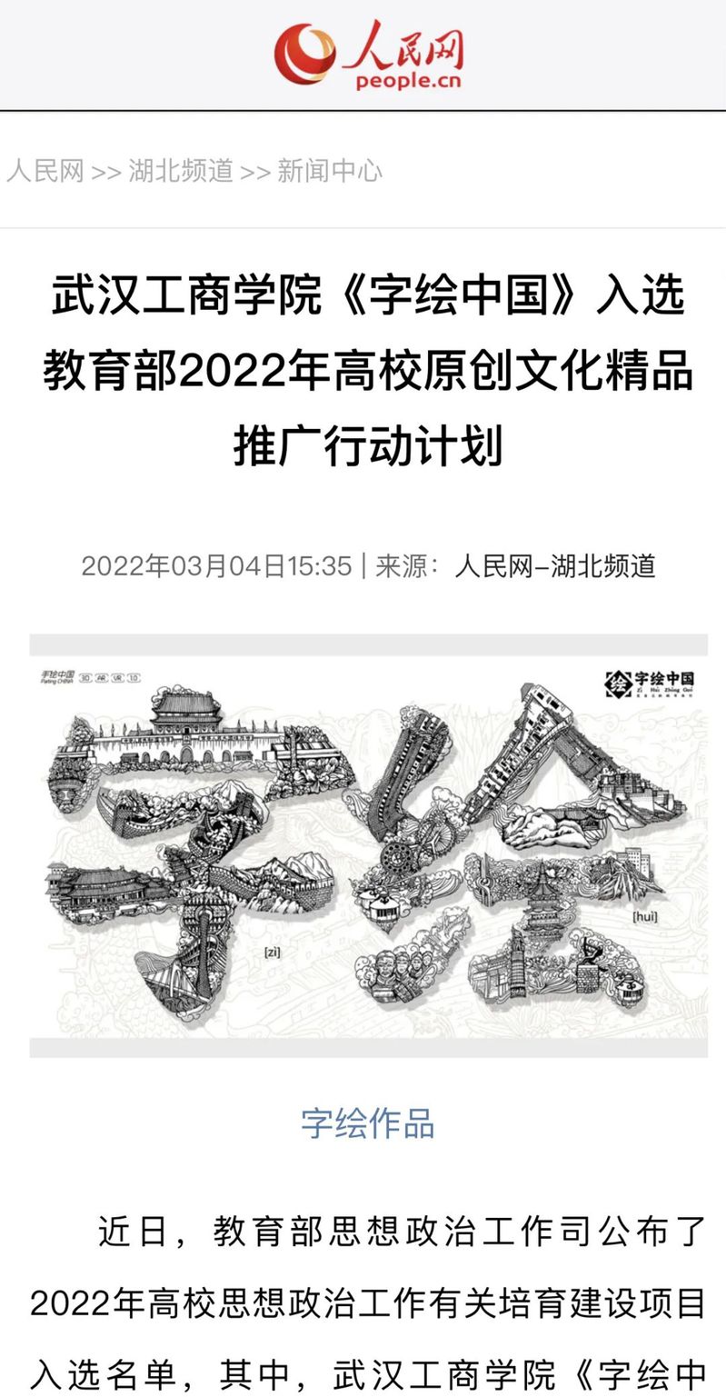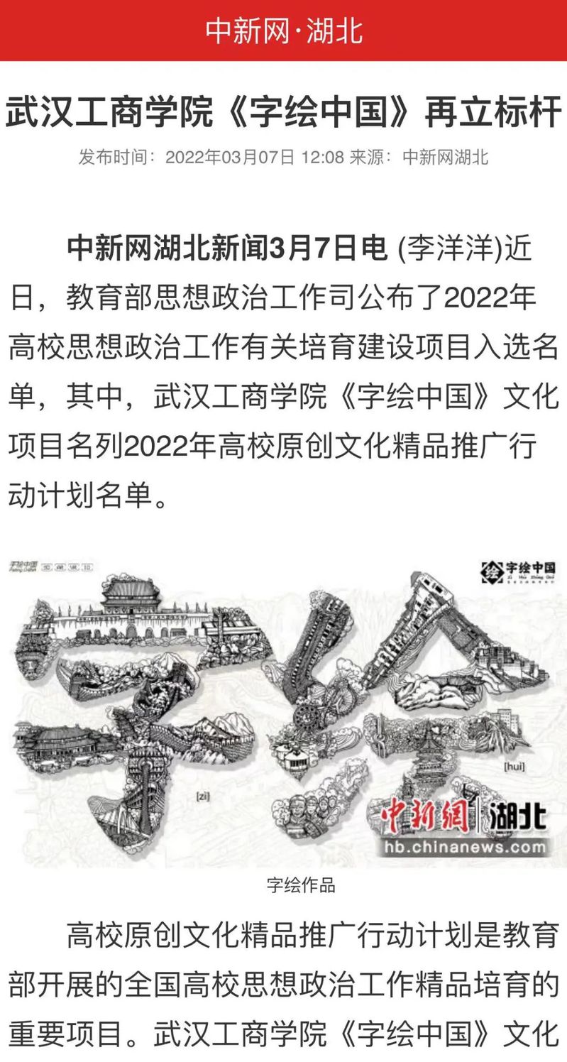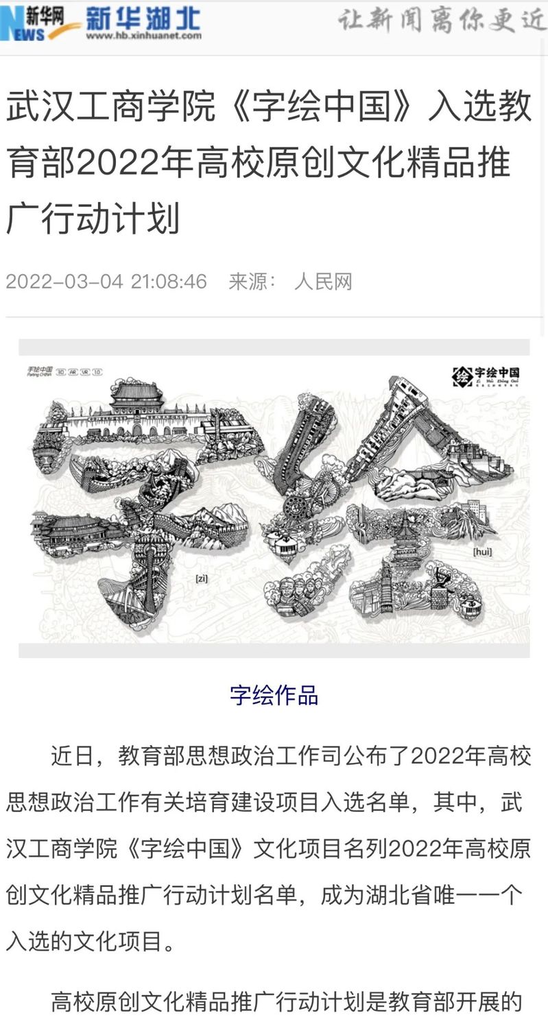近日,教育部思想政治工作司公布了2022年高校思想政治工作有关培育建设项目入选名单,其中,beat365中文官方网站《字绘中国》文化项目名列2022年高校原创文化精品推广行动计划名单,成为湖北省唯一一个入选的文化项目。