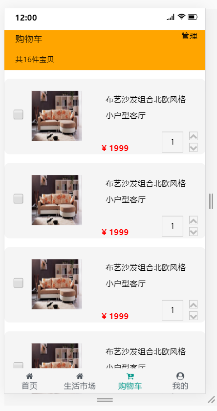 购物车的主要功能就是呈现你所添加的所有商品,方便我们购买。可以将商品进行删除和添加。同样可以清楚的观看的自己所选商品的图片、颜色、介绍、价钱和数量。同样还可以对商品的数量进行添加。点击所添加商品前面的按钮就会算出相应的总价钱。点击全选按钮就会选中所有添加的商品,方便想要全部购买的用户。点击结算就会跳出确认订单的页面,更清楚的了解到我们所选的是否是我们所需的。
