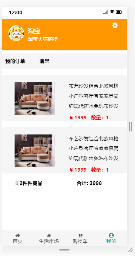 分别为首页、购物车、消息和我的。由这四个选项作为媒介点击进入到其他不同的网页中去。