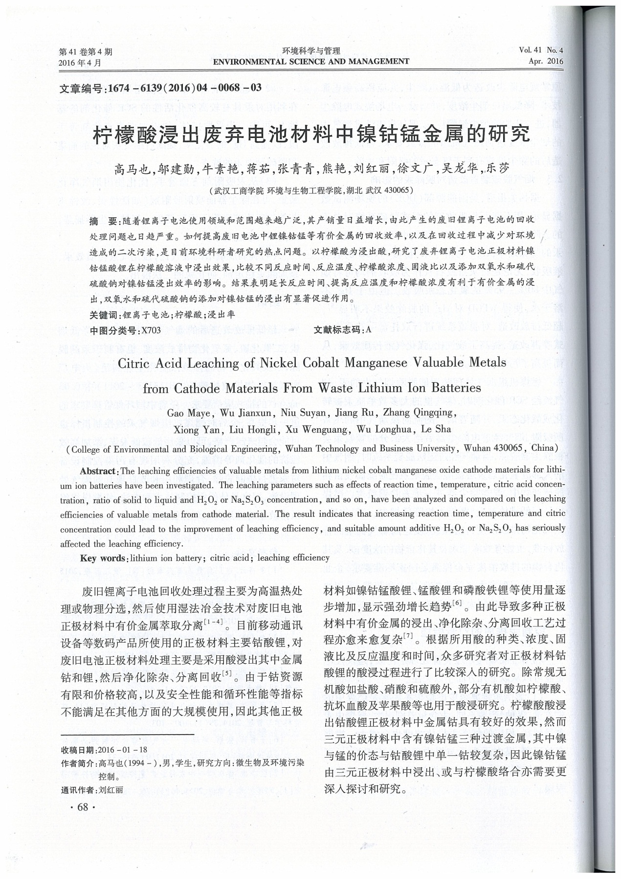 柠檬酸浸出废弃电池材料中镍钴锰有价金属的研究