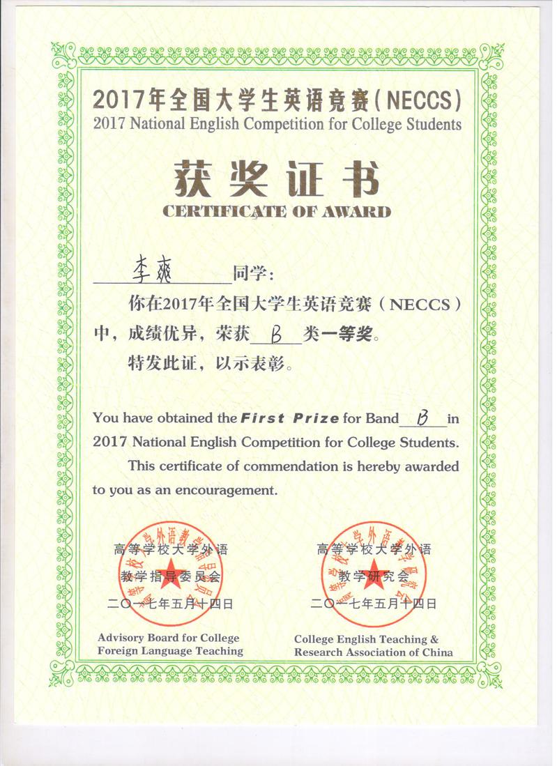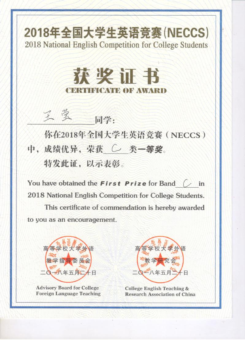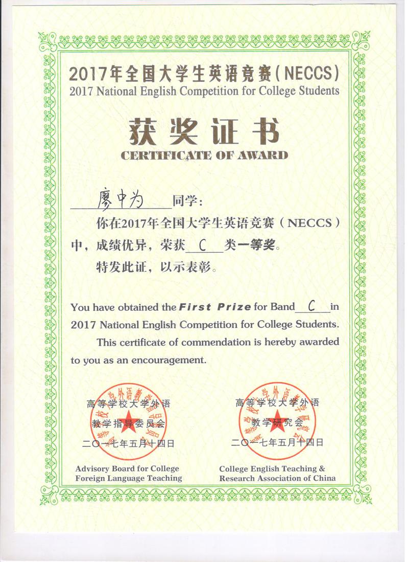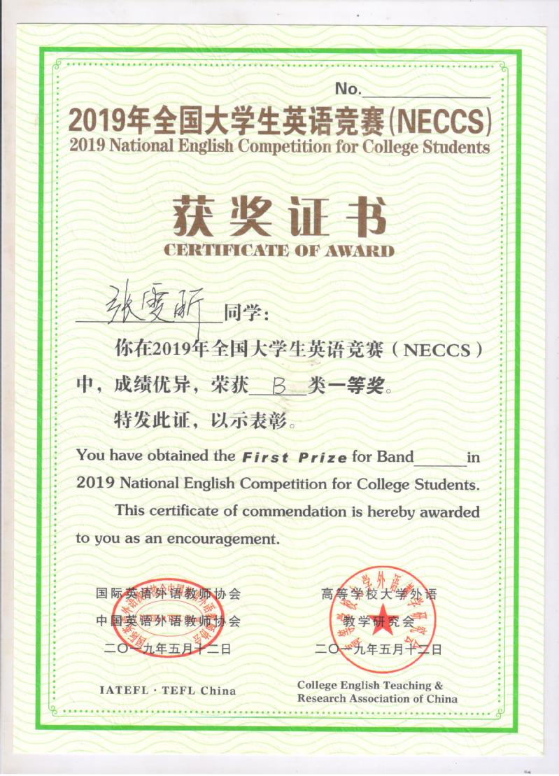全国大学生英语竞赛(NECCS)是经国家教育部批准,旨在落实大学英语教学改革精神,激发广大大学生学习英语的兴趣,促进大学生英语水平的全面提高。下图分别为我校学生近三年(2017-2019年)获得一等奖证书: