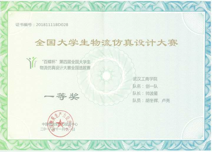 6 | 第一届“百蝶杯”全国物流仿真设计大赛湖北省赛区 | 省部级 | 一等奖 | 卢亮/16910041 帅波星/16910054 胡东辉/16910036 | 周小芬 | 43415 |