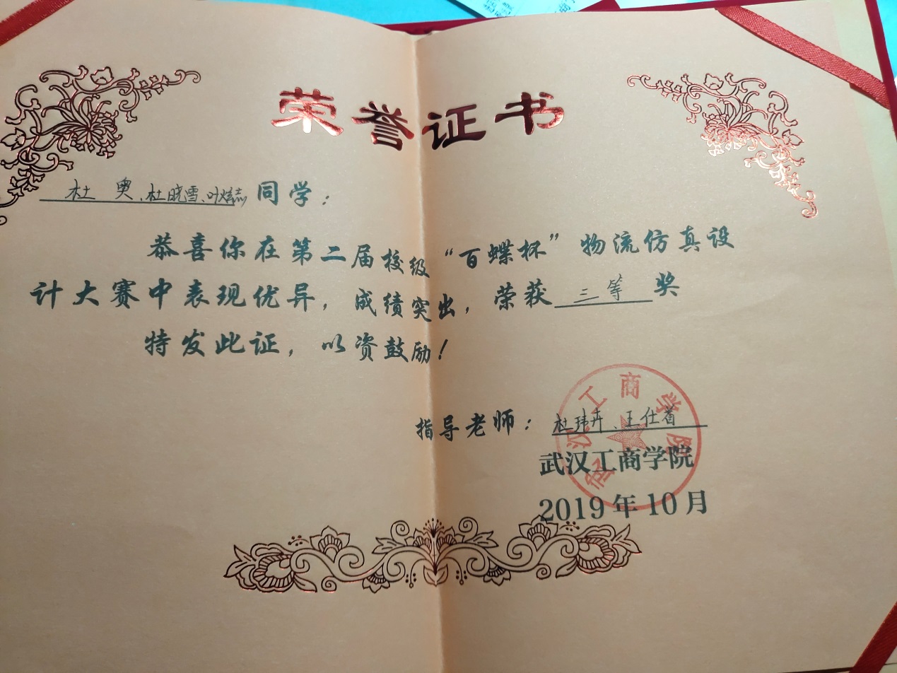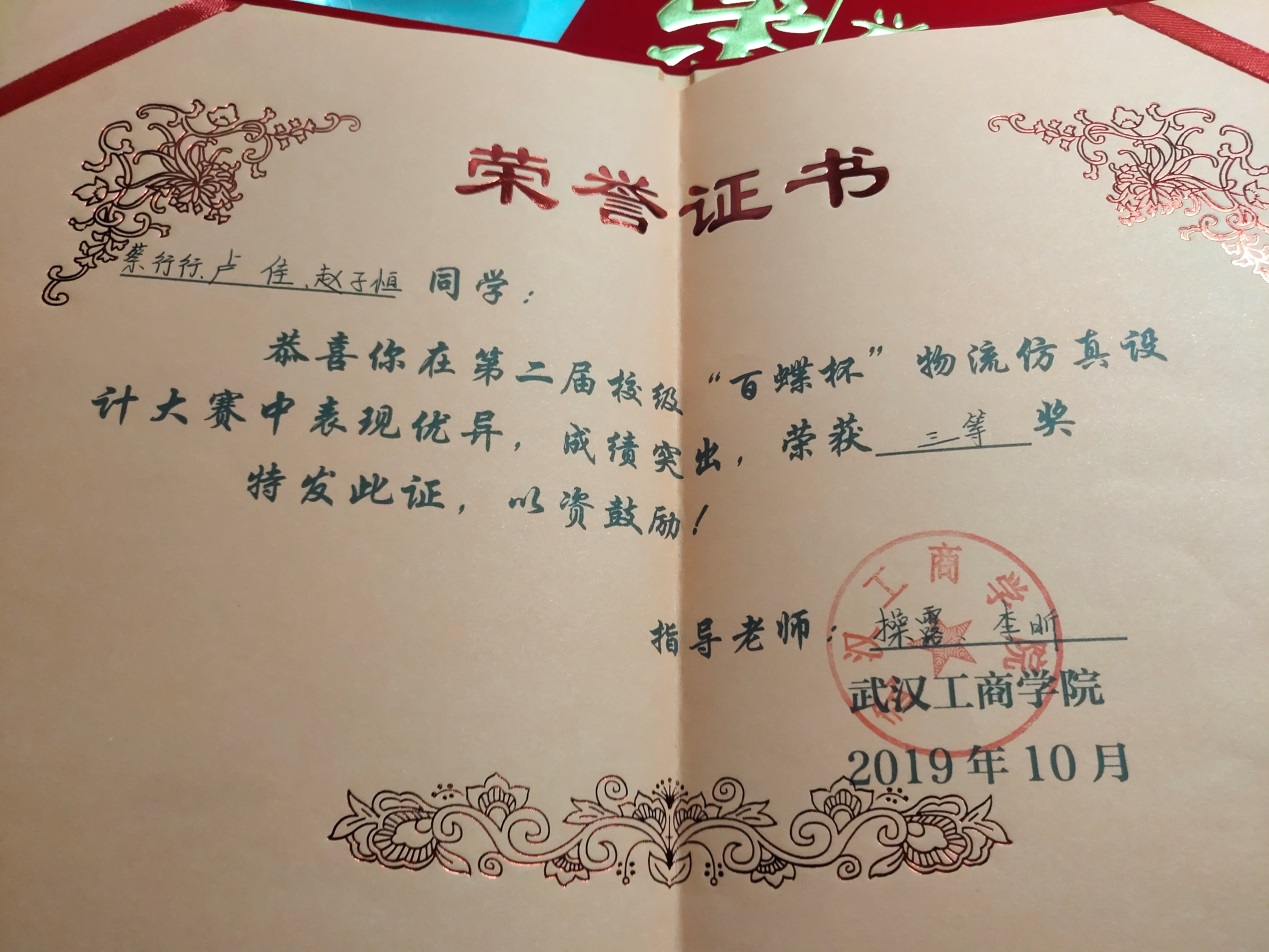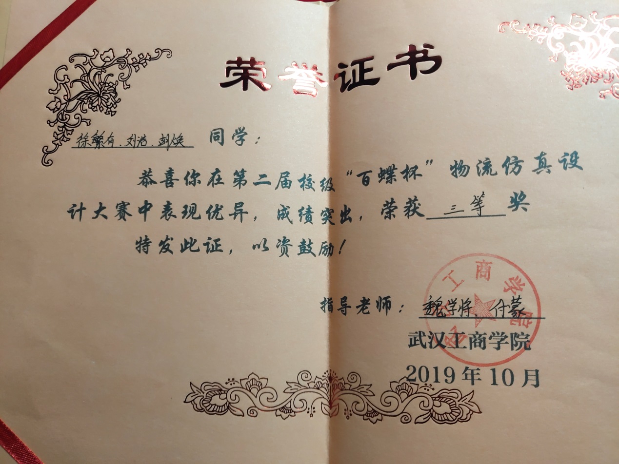 “百蝶杯”全国大学生物流仿真设计大赛 | 省部级 | 三等奖 | 17901059田妮、17901020田汪华、17901062李巧玲 | 付蒙 周小芬 | 2019.11 | |