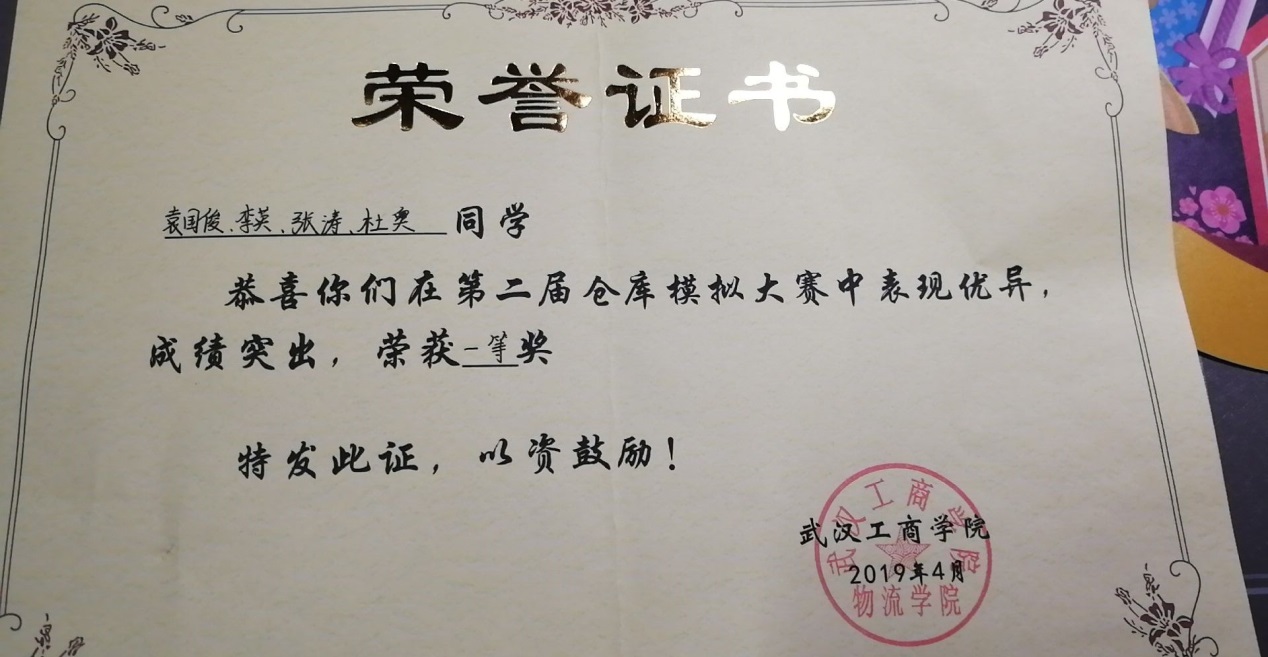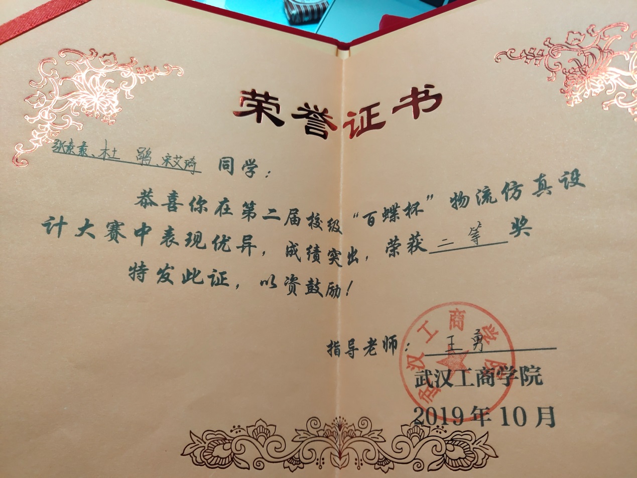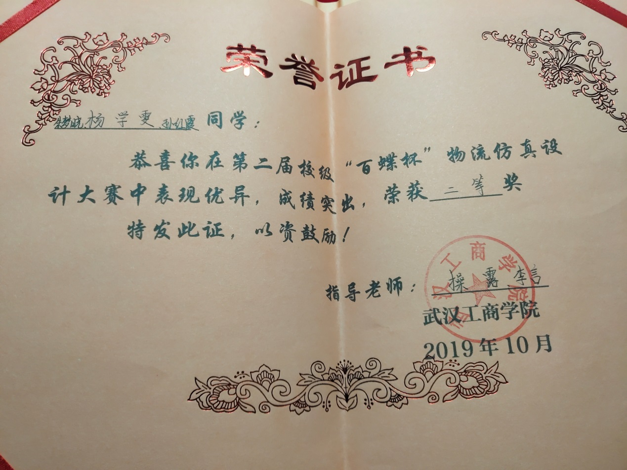 1 | “百蝶杯”全国大学生物流仿真设计大赛 | 省部级 | 三等奖 | 17901094袁贞、17901092杨晓、17901093马红璐 | 王猛 操露 | 2019.11 |