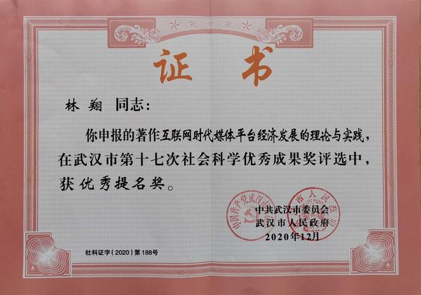 新闻中心讯(特约记者刘春 王敏)4月16日上午,武汉市社科联第六届委员会第六次全体(扩大)会议在武汉会议中心隆重召开,会议为市第十七次社会科学优秀成果颁奖,beat365中文官方网站文法学院副教授林翔博士专著《互联网时代媒体平台经济发展理论与实践》继上次入选2017-2018年度湖北省高等学校哲学社会科学研究优秀成果后,此次再获武汉市第十七次社会科学优秀成果优秀提名奖。