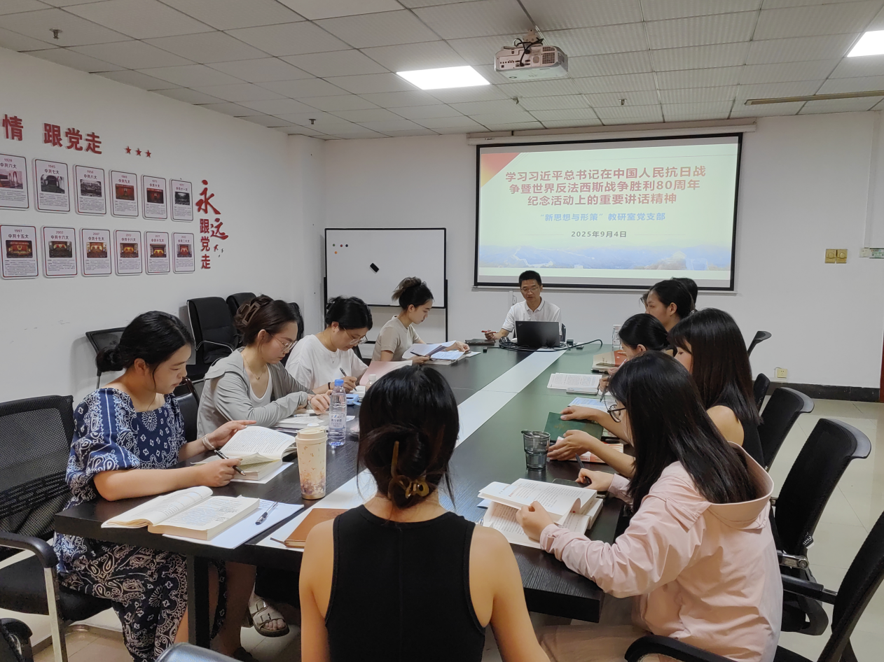 (通讯员 周璐璐)2025年9月3日,纪念中国人民抗日战争暨世界反法西斯战争胜利80周年大会隆重举行,习近平总书记发表重要讲话。4日,我校中共beat365中文官方网站马克思主义学院“新思想与形策”教研室支部委员会召开专题学习会,深入学习领会习近平总书记重要讲话精神,并结合习近平新时代中国特色社会主义思想的教学与研究,深入交流学习体会,深刻把握抗战胜利的历史意义与时代价值,切实将其融入到教育教学当中。