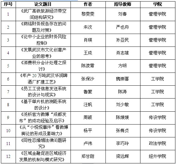 新闻中心讯(记者 鲍欢)近日,湖北省人民政府学位委员会、湖北省教育厅公布了2012年全省优秀学位论文评选结果。我校共有12篇学士学位论文获奖。其中,管理学院5篇,工学院3篇,传设学院2篇,政法学院、经外学院各1篇。