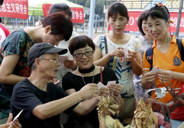 图为武汉折纸大师李兴旺正在教大家学习折纸 摄影:谢晓霜