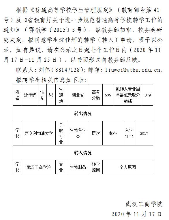 关于同意学生沈佳辉转学申请的公示