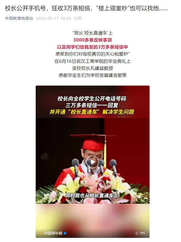 中国教育电视台微信公众号:校长公开手机号,狂收3万条短信,“楼上寝室吵”也可以找他......