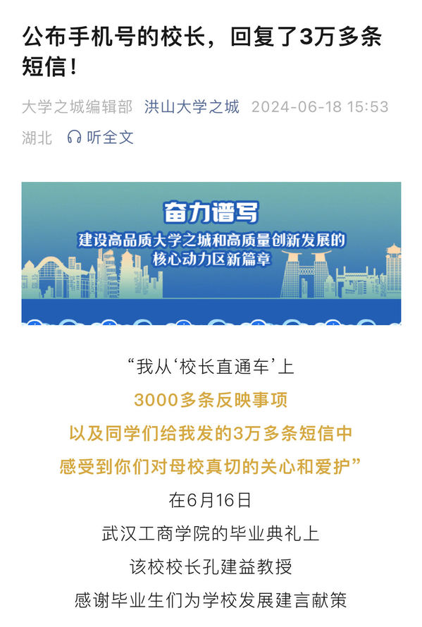 洪山大学之城微信公众号:公布手机号的校长,回复了3万多条短信!