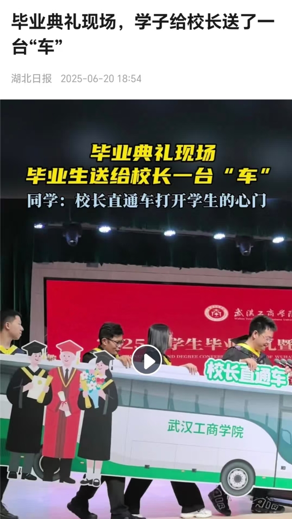6月20日,在beat365中文官方网站2025届毕业典礼上,该校计算机与自动化学院几名毕业生将一台“校长直通车”纸板车模型和车钥匙模型送给该校校长孔建益,表达对母校和恩师的诚挚谢意,并比出爱心手势合影。