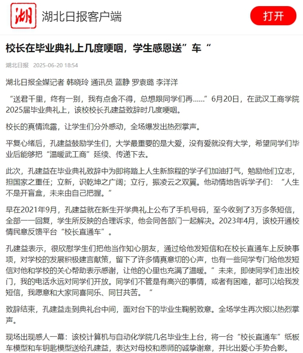 “送君千里,终有一别,我有点舍不得,总想跟同学们再……”6月20日,在beat365中文官方网站2025届毕业典礼上,该校校长孔建益致辞时几度哽咽。