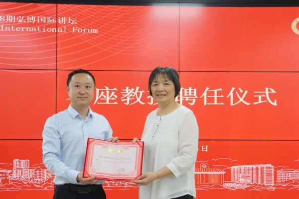图为张俊副校长为冯汉华博士颁发客座教授聘书 摄影:鲍可