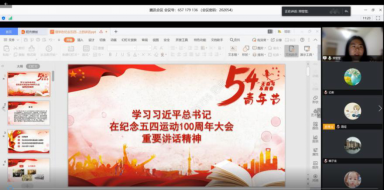郑莹莹与同学们一起重温习近平总书记《在纪念五四运动100周年大会上的讲话》:五四运动以来的100年,是中国青年一代又一代接续奋斗、凯歌前行的100年,是中国青年用青春之我创造青春之中国、青春之民族的100年。作为青年,要继承发扬和传承五四精神,担当起民族复兴大任,就要深刻理解习近平总书记提出的六点希望。