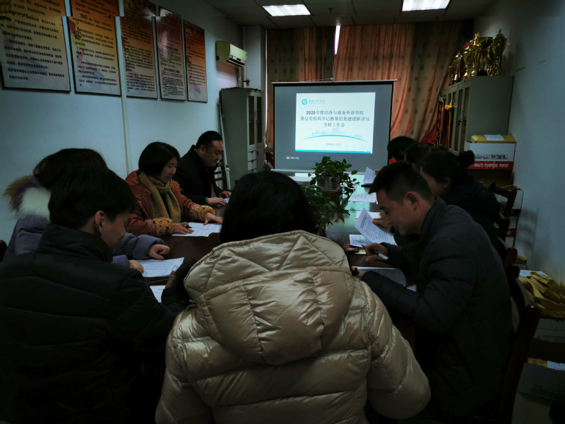 2021年1月5日中午12:30在综合楼904开展了2020年度经济与商务外语学院基层党组织书记抓基层党建述职评议考核工作参会人员有经济与商务外语学院党总支书记胡航、行政党支部书记黄燕、党支部书记黄欣、党支部书记黄净、学生第一党支部书记甘甜、学生第二党支部书记田飞燕、学生第三党支部书记凡萌、学院结转党支部书记徐可、教师党员代表陈桂华、乔菲。