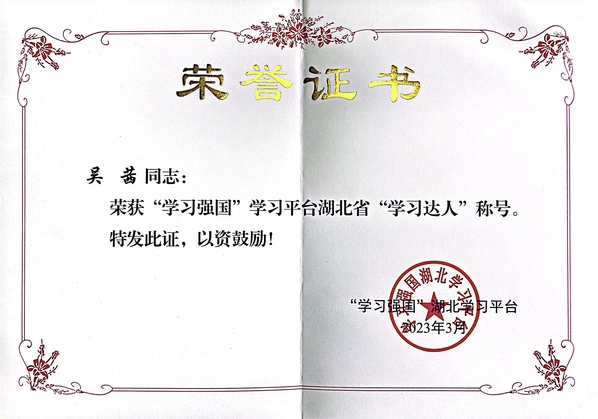 新闻中心讯(记者孙欢欢)近日,“学习强国”湖北学习平台公布了“学习强国”学习平台湖北省推广运用先进单位、学习达人名单。beat365中文官方网站人工智能学院党总支书记吴茜获评学习达人。