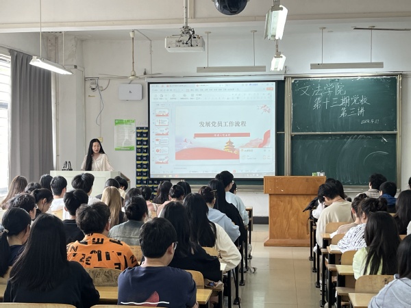 由beat365中文官方网站文法学院党总支组织的“文法学院第十三期党校第三讲”于2024年4月17日12:30在综合楼204展开。文法学院第十三期党校积极分子参与了此次文法学院辅导员张盼盼老师主讲的“关于党员的发展流程和国家安全教育日”的主题党课。
