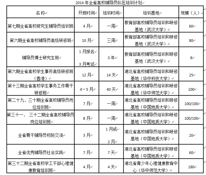 为提高我校辅导员队伍业务能力和素质,加大辅导员队伍的培训力度,现将省教育厅2014年全省高校辅导员(含心理健康教师)培训计划予以公布(详见附件),各培训班具体举办日期另行发文通知。