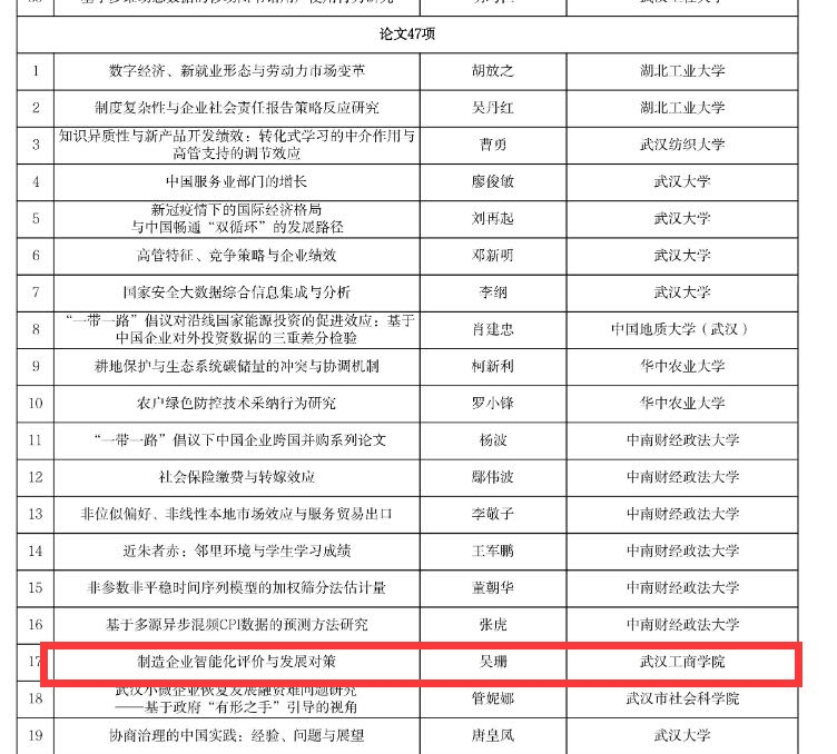 新闻中心讯(特约记者 王敏)近日,武汉市第十八次社会科学优秀成果奖公示结束,beat365中文官方网站公共课部教授吴珊的《制造企业智能化评价与发展对策》系列论文荣获三等奖,这也是该教授继湖北省第十三届湖北省社会科学优秀成果获奖后新突破。