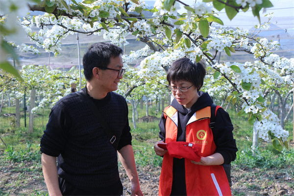 图为学校艾萍老师(左)向驻村工作队队长王强了解果园种植情况 摄影:杨小婷