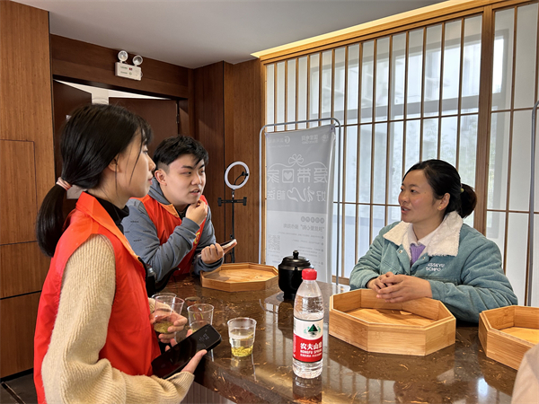 图为学生与九畹丝绵茶厂的工作人员交流 摄影:谢惠卉
