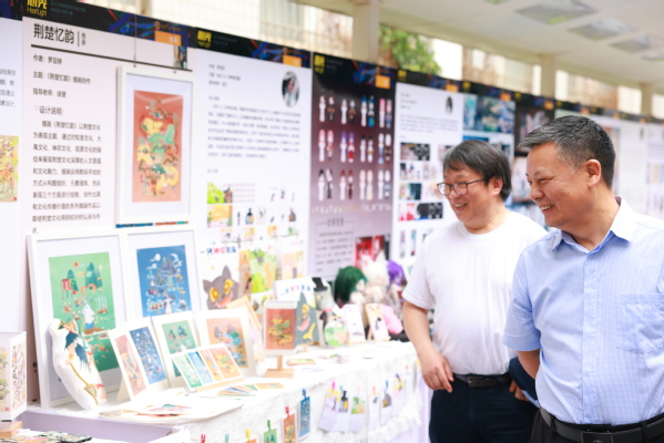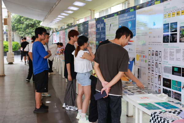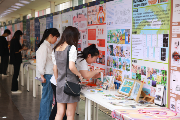 在展览现场,毕业生们向师生介绍自己的作品,分享设计灵感和创作过程。环境设计专业毕业生祝欢欢、张益龙、郑逸伟、龚浩宇创作的《龟山村红色旅游文化景观设计》系列作品,对龟山村乡村历史文化资源进行深入挖掘、巧妙构思,设计出兼具教育意义和观赏价值的乡村景观小品、景观建筑。
