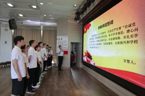 刘生元书记为新教师代表佩戴校徽,衷心祝贺新教师们成为武工商的一份子,并带领大家举行新教师入职宣誓仪式,签署《教师师德承诺书》。