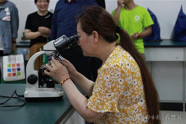 家校互动日,环生学院的一位学生家长正在实验室使用显微镜 摄影:柳康龙