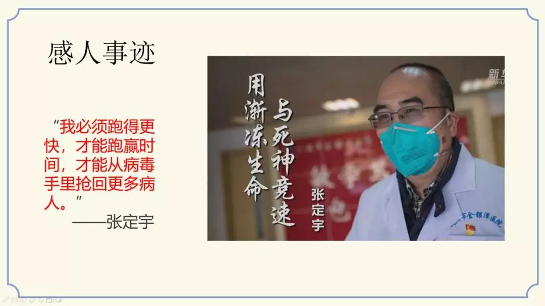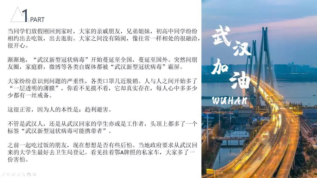 “生命可贵,医护应被崇敬。我所制作的PPT为新型冠状病毒致敬最美逆行者。没什么岁月静好,只是有人替我们负重前行。大年初一,医护人员依旧忙碌,在救死扶伤、安全保卫的第一线,坚守自己的岗位,他们用“舍”和“守”撑起百姓的安康,为人民的健康保驾护航,抗击疫情,他们一直准备着。”