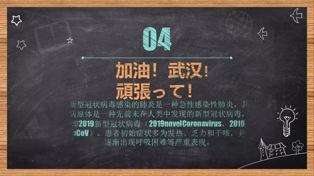 “抗击新型冠状病毒,我们在行动。我制作的PPT的亮点是结合了较多的二次元元素和较为突出的特效以展现出我PPT的风格。
