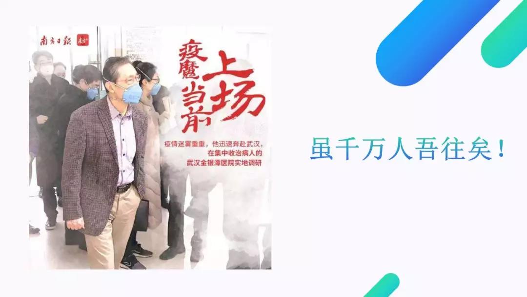 我是18计科本11的周雁同学,此次我主要选择了钟南山院士和韩红偶像来进行我此次的PPT演讲,他们一个在奔赴在抗疫最前线,一个在后面给予全国人民的财力,物力和人力,为我们提供了强有力的后援。中国有此二人,何愁疫情不去,雾霾不散,阳光不来!