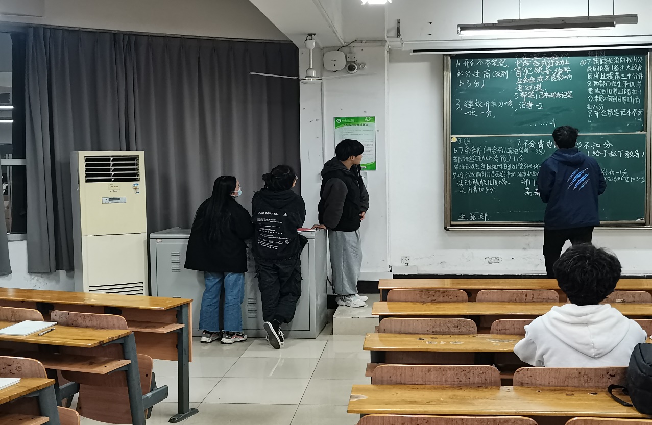 本次会议首先进行人员的签到,确保各部门2020级人员的全部到齐。其次由各部门讨论学生会加减分制度,提出建议,并把各自的想法写在黑板上,各部门进行集思广益,对每项新措施进行投票。