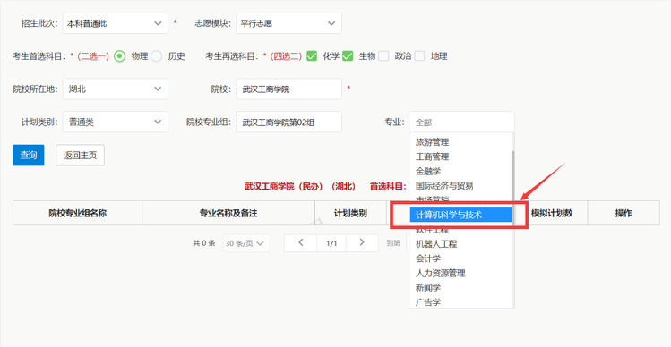 首页默认为招生计划查询主页,以本科普通批为例,点击进入按钮,进入该批次模拟招生计划查询页面。