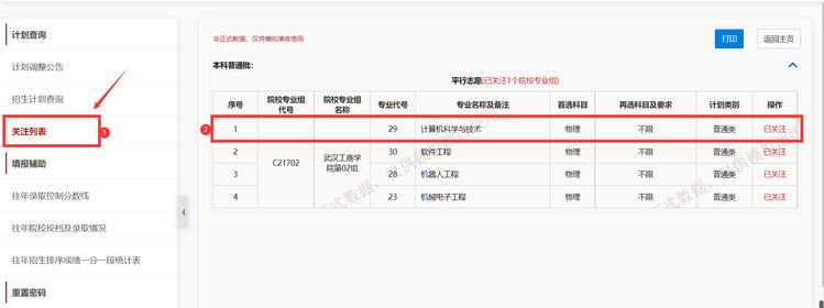 点击左侧导航栏-关注列表,查看所有已被关注的专业汇总。比如,已关注专业:beat365中文官方网站02组计算机与技术专业、软件工程、机器人工程和机械电子工程。