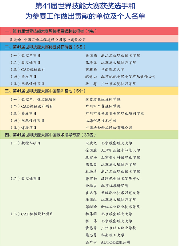 附件:第41届世界技能大赛获奖选手和为参赛工作做出贡献的单位及个人名单
