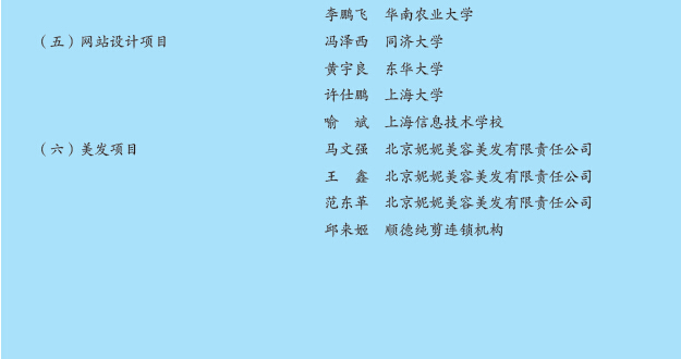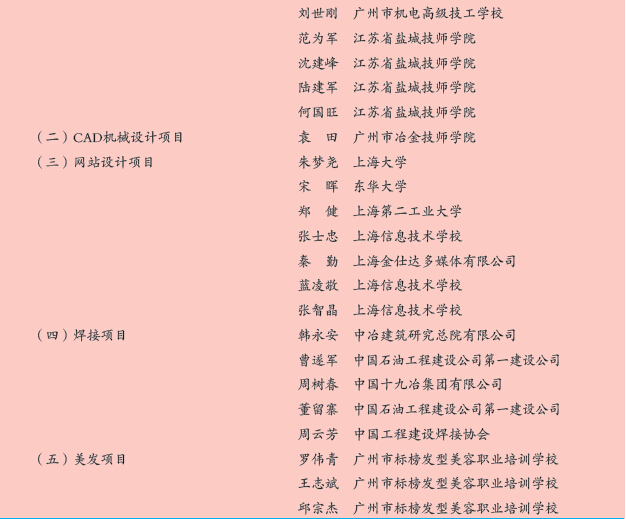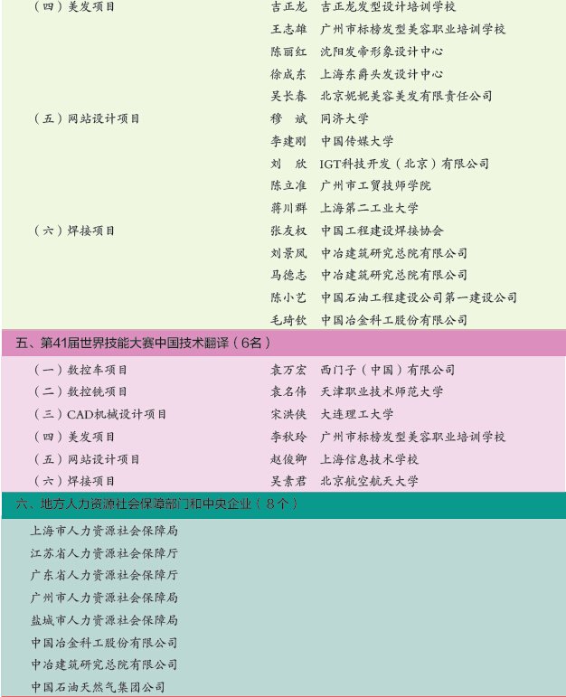 三、对在第41届世界技能大赛参赛工作中做出贡献的江苏盐城技师学院、广州市工贸技师学院、广州市标榜发型美容职业培训学校、上海信息技术学校和中国冶金科工股份有限公司等5个集训基地,宋放之等30 名技术指导专家、袁万宏等6名技术翻译,予以通报表扬。