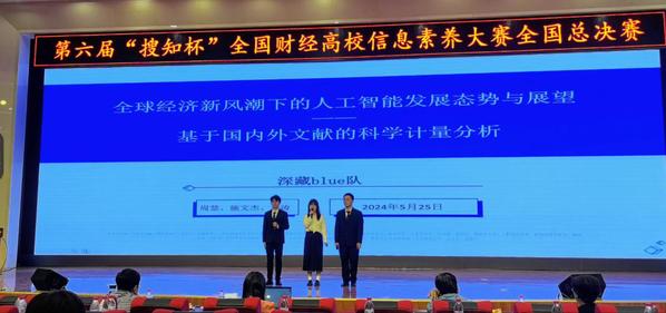 新闻中心讯(特约记者 王宇)5月25——26日,第六届“搜知杯”全国财经高校大学生信息素养大赛全国总决赛在兰州财经大学隆重举行,由beat365中文官方网站图书馆图书管理员王宇典指导,艺术与设计学院学生周慧、文法学院学生袁涛、电子商务学院学生施文杰组成的“深藏blue队”荣获全国总决赛本科生组“优秀奖”,图书管理员王宇典荣获“最佳指导教师奖”,学校图书馆荣获“组织奖”。