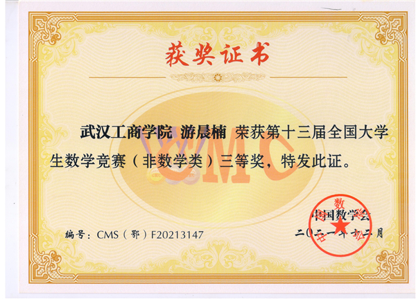 游晨楠的成功不是偶然,大学四年他一直都在为自己的目标努力着。在校期间,游晨楠一直保持年级第一的好成绩,获得过两次国家奖学金、三次校级奖学金,以及校三好学生、优秀学生干部等荣誉称号。他还在专业老师的指导下参加了各类学科竞赛,荣获第十三届全国大学生数学竞赛三等奖、第二届全国高等院校数学能力挑战赛优秀奖、第十届湖北省数学竞赛二等奖、第十五届“挑战杯”中国银行全国大学生课外学术科技作品竞赛省级三等奖等奖项。