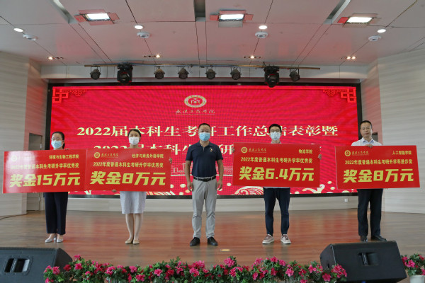 教务部常务副部长陈涛宣读了《关于表彰2022年度本科生考研先进单位、先进学生的决定》,环境与生物工程学院、经济与商务外语学院、物流学院获考研升学率优秀奖,分别获得15万元、8万元、6.4万元奖金;人工智能学院获考研升学率进步奖,奖金8万元;99名考研优秀学生每人获得奖金500元,共计4.95万元。本次共计发放奖金42.35万元。