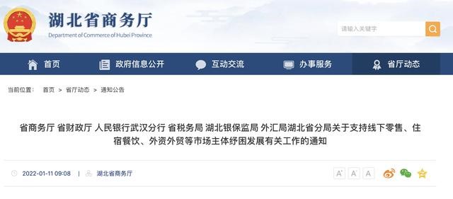 1月11日,省商务厅官网发布《省商务厅省财政厅人民银行武汉分行省税务局湖北银保监局外汇局湖北省分局关于支持线下零售、住宿餐饮、外资外贸等市场主体纾困发展有关工作的通知》。